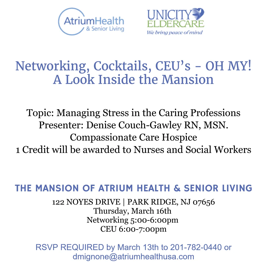 The Campus of Atrium Health & Senior Living of Park Ridge in collaboration with Unicity Healthcare invite you to an evening of cocktails, networking, and education! First join us for some cocktails, hors d’oeuvres, and networking followed by a Continuing Education Unit.